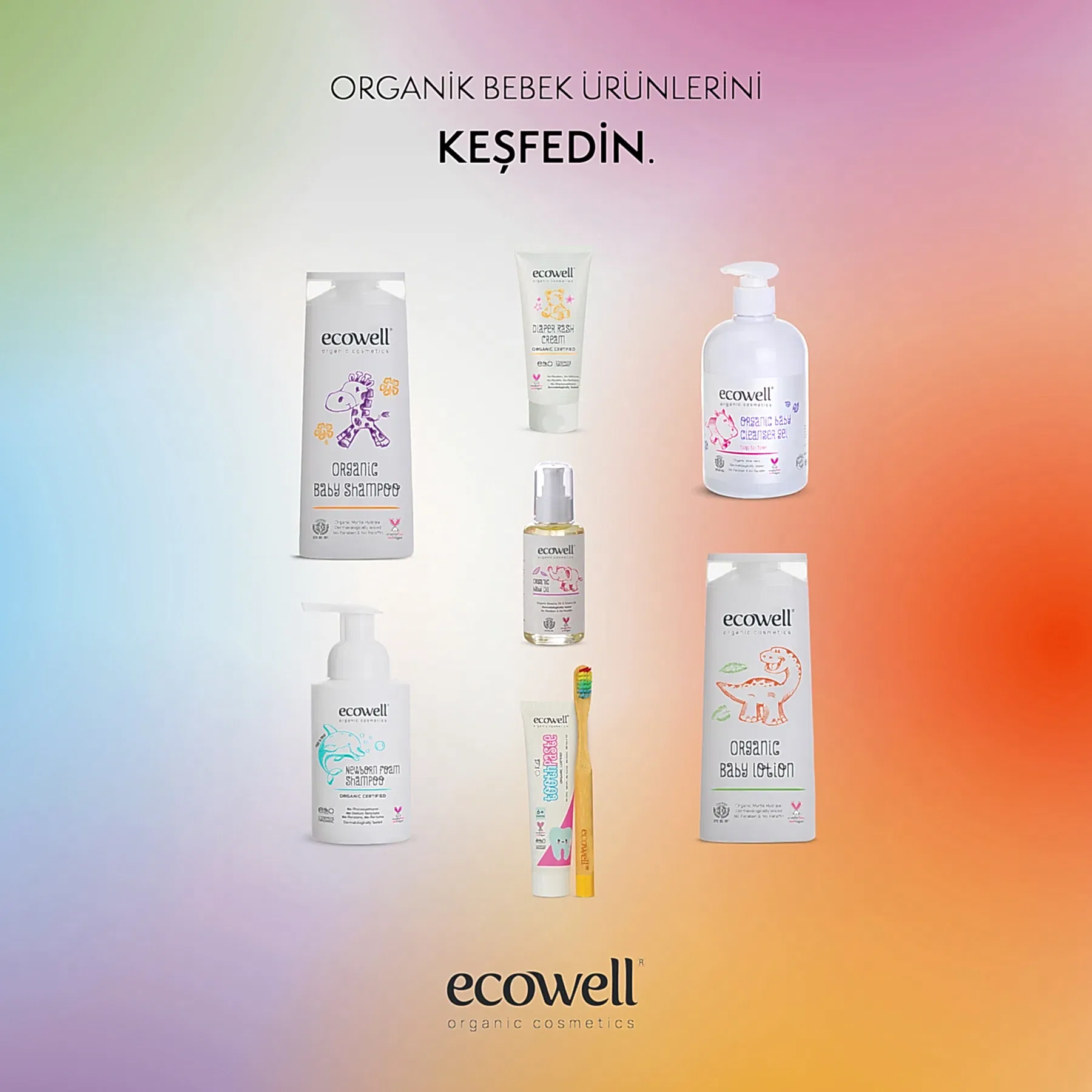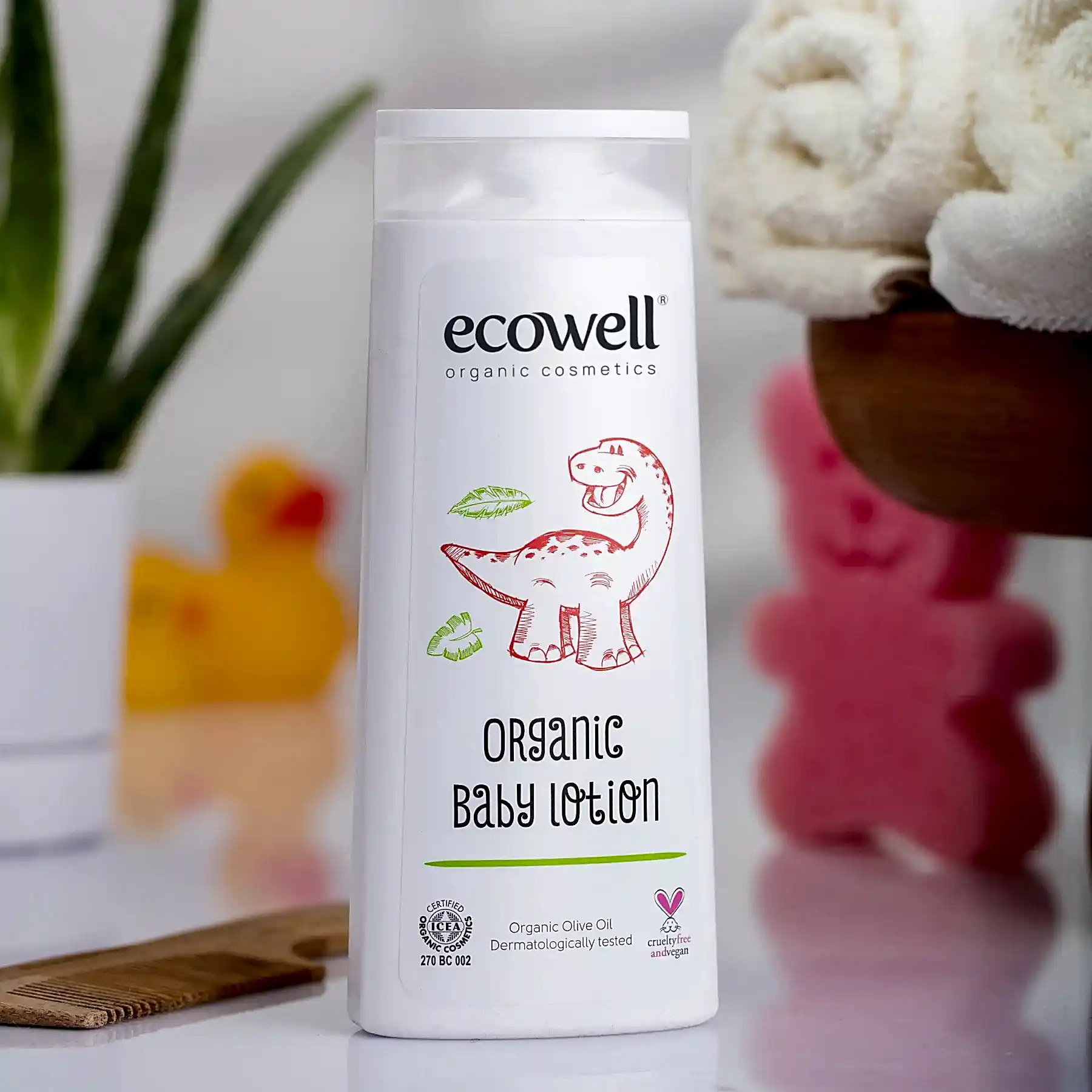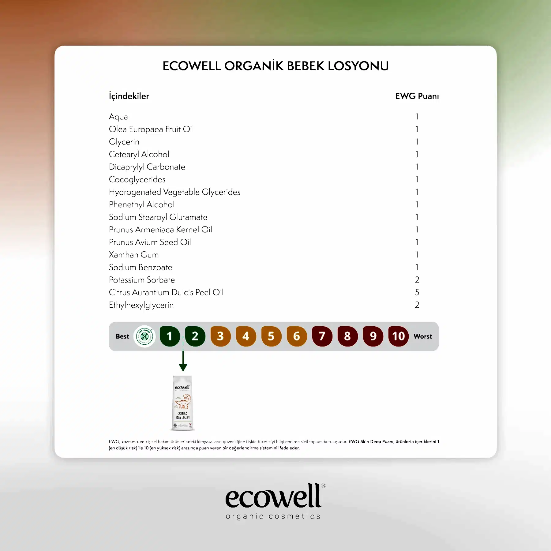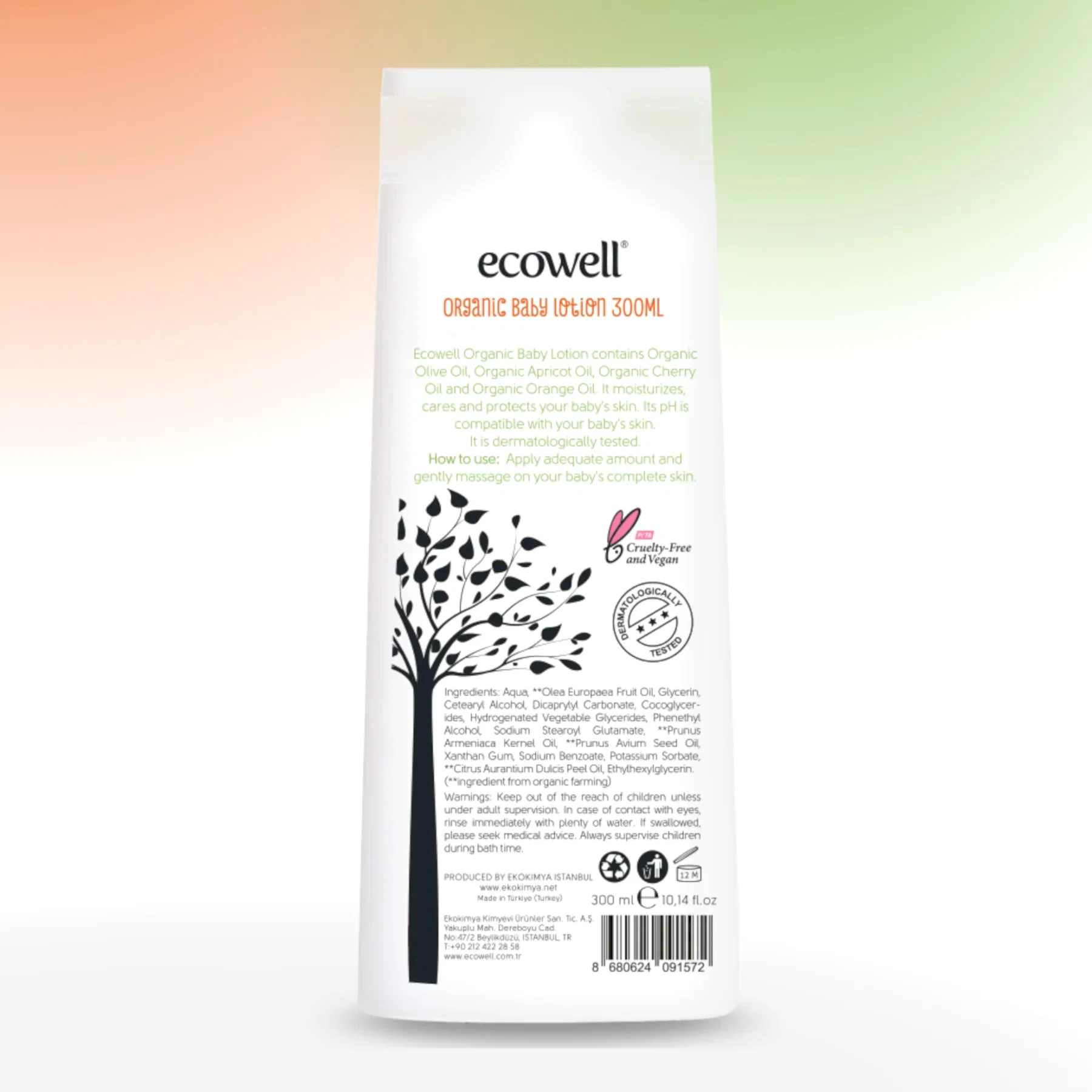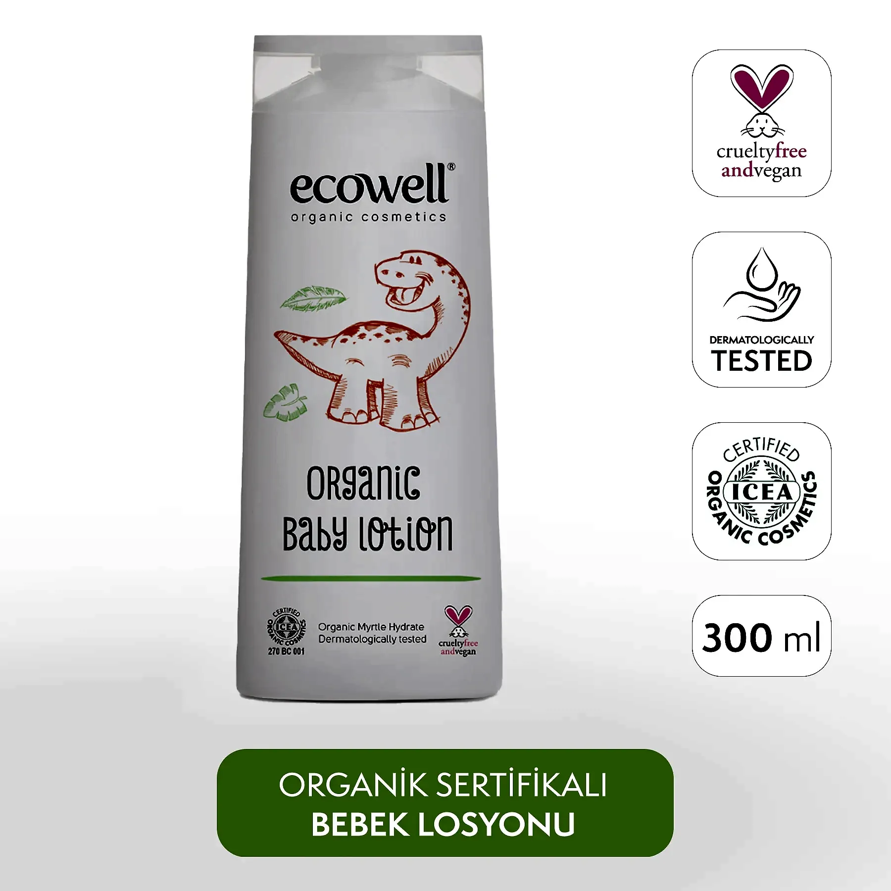 Ecowell Organik Bebek Losyonu, bebeğinizin hassas cildi için hafif ve hızlı emilen bir nemlendirme sağlar. Organik zeytinyağı, kayısı yağı, portakal yağı ve vişne yağı içeren formülü, cildin nem dengesini korur ve yumuşacık bir his oluşturur.