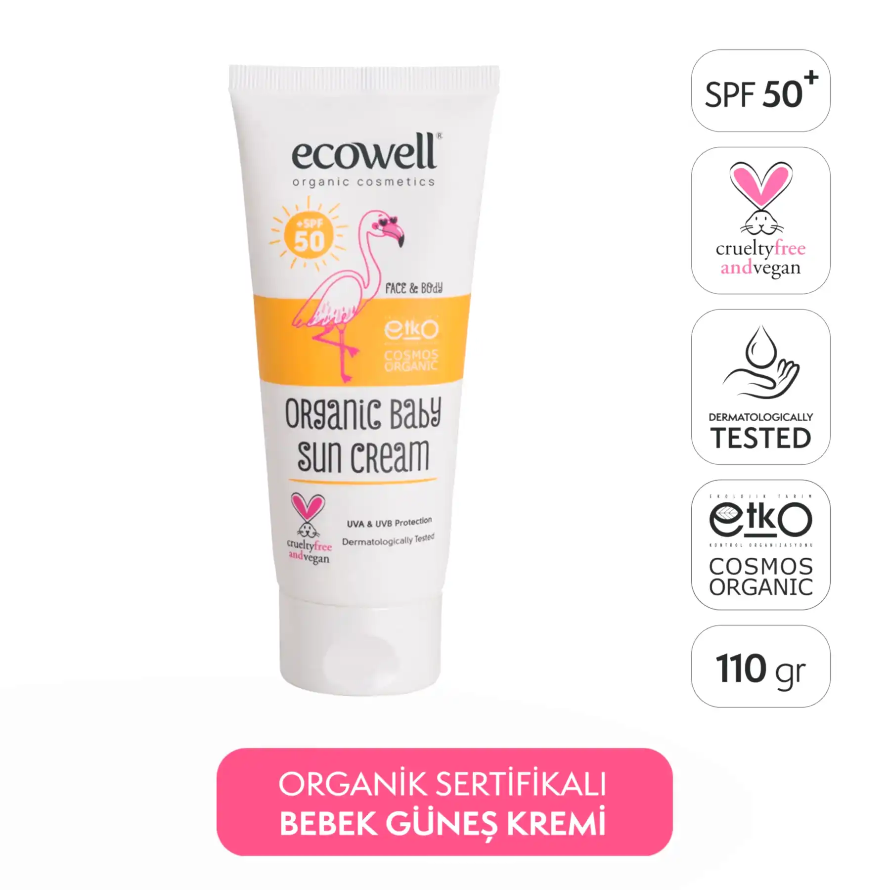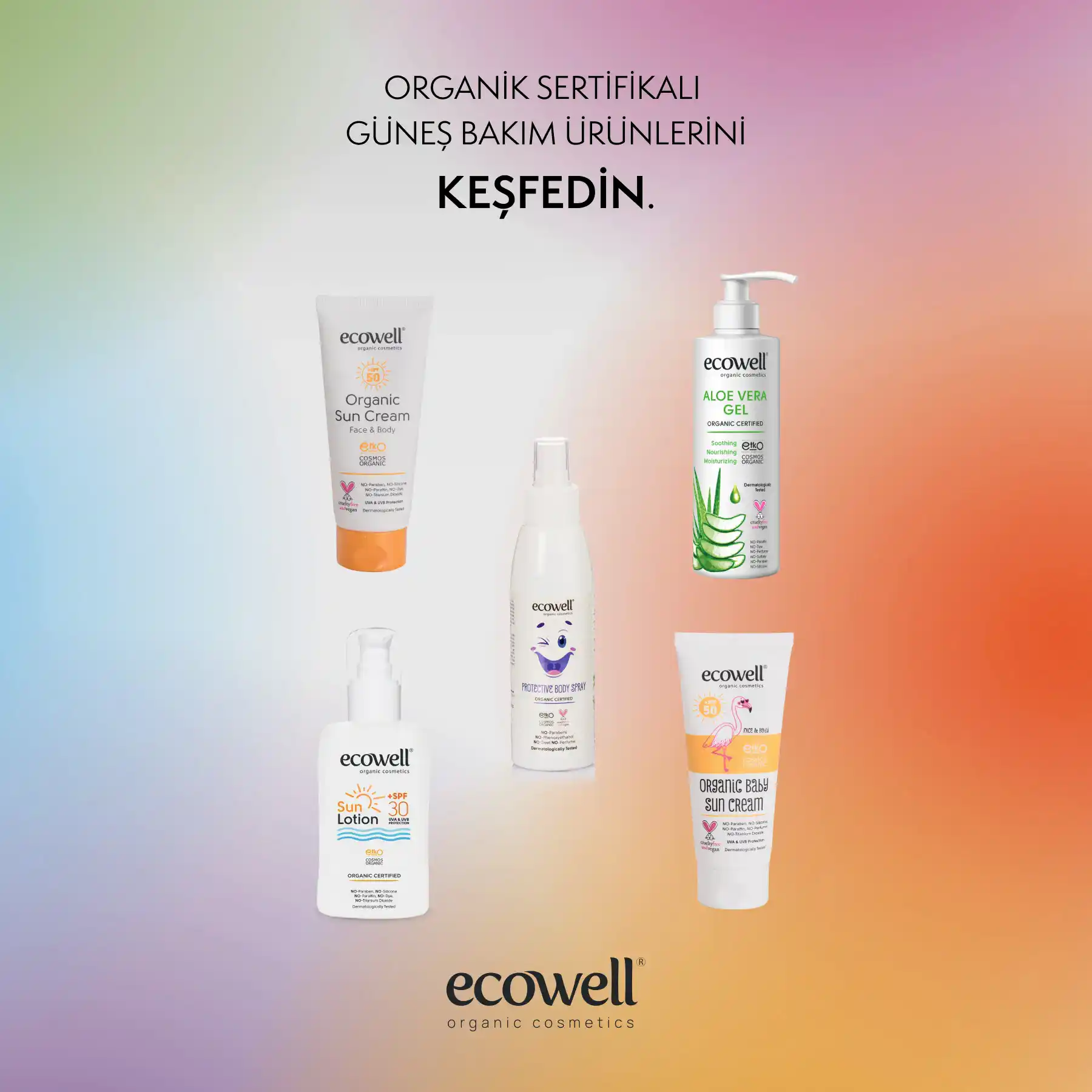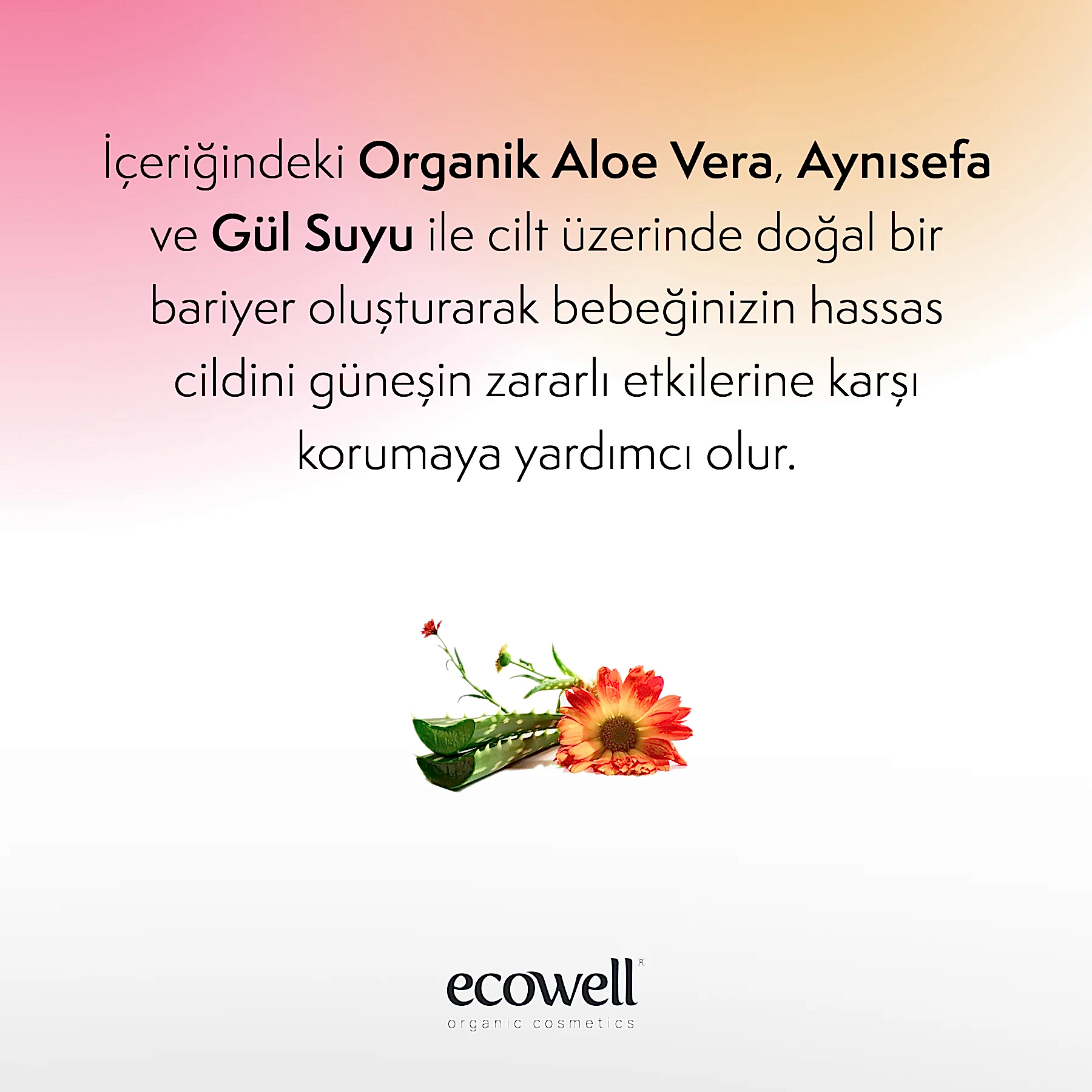 Ecowell Organik Bebek Güneş Kremi SPF 50, mineral filtrelerle güçlendirilmiş içeriği sayesinde UVA ve UVB koruması sağlar. Organik aloe vera, aynısefa ve gül suyu içeren formülü cildi yatıştırır, nemlendirir ve güneş sonrası kuruluk hissini azaltmaya yardımcı olur.