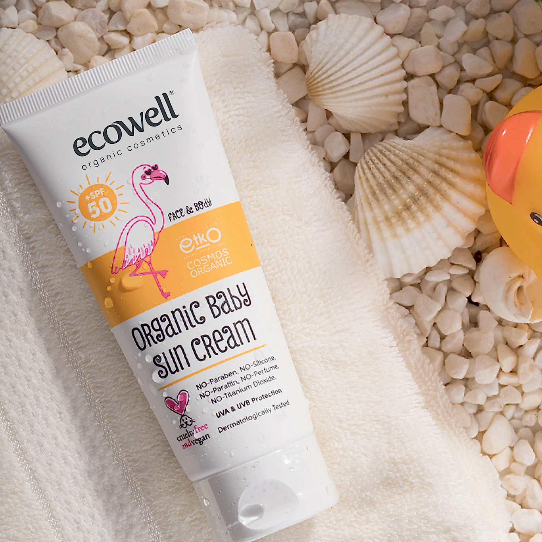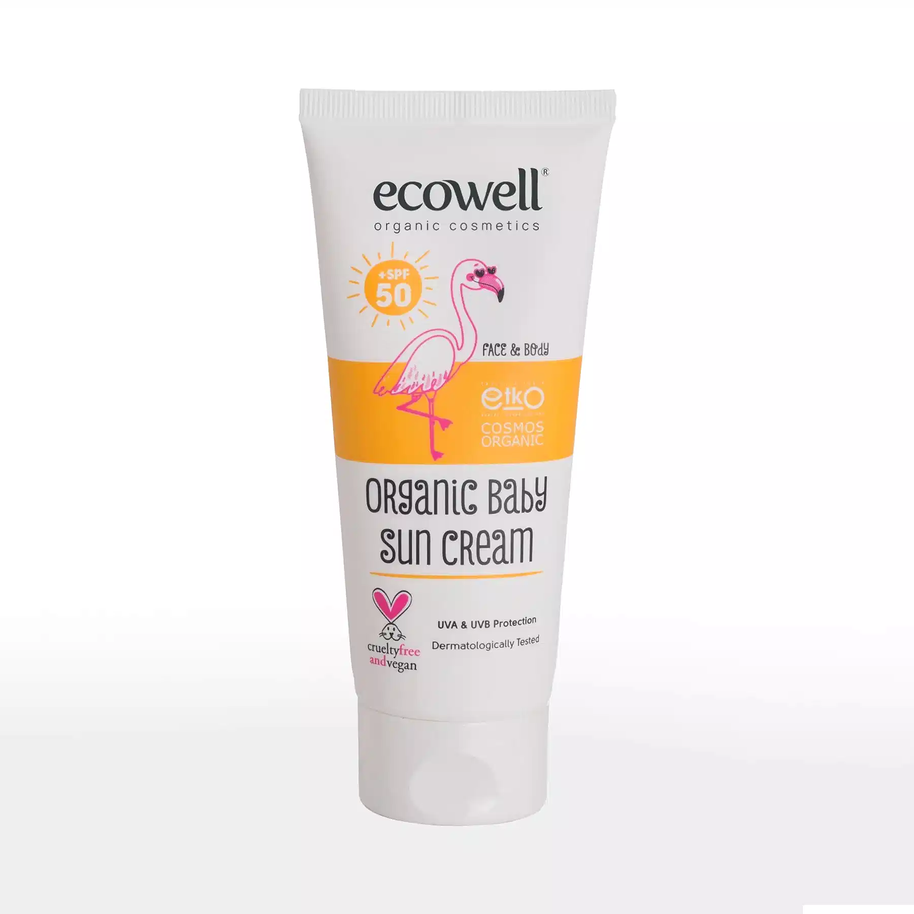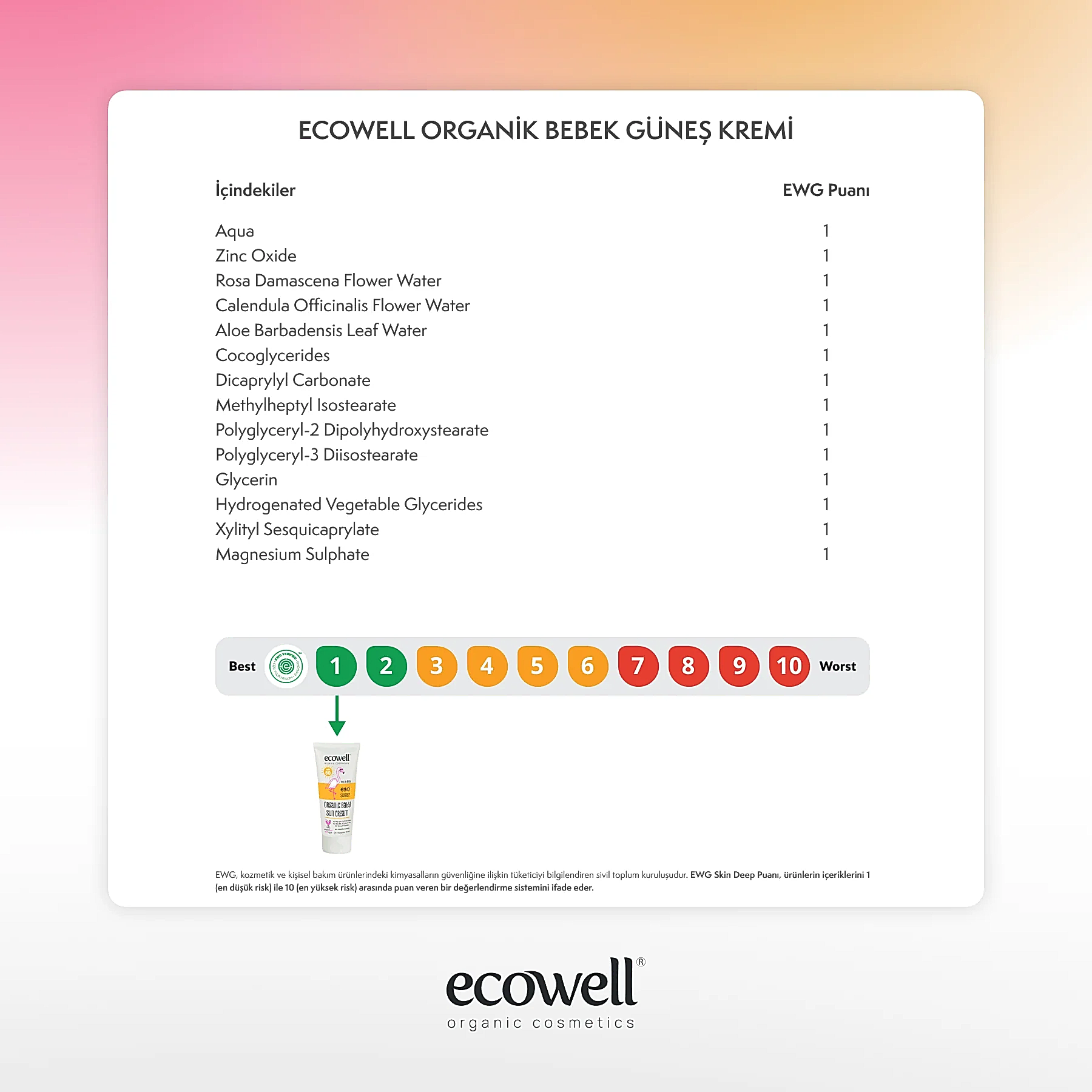 Ecowell Organik Bebek Güneş Kremi SPF 50, mineral filtrelerle güçlendirilmiş içeriği sayesinde UVA ve UVB koruması sağlar. Organik aloe vera, aynısefa ve gül suyu içeren formülü cildi yatıştırır, nemlendirir ve güneş sonrası kuruluk hissini azaltmaya yardımcı olur.